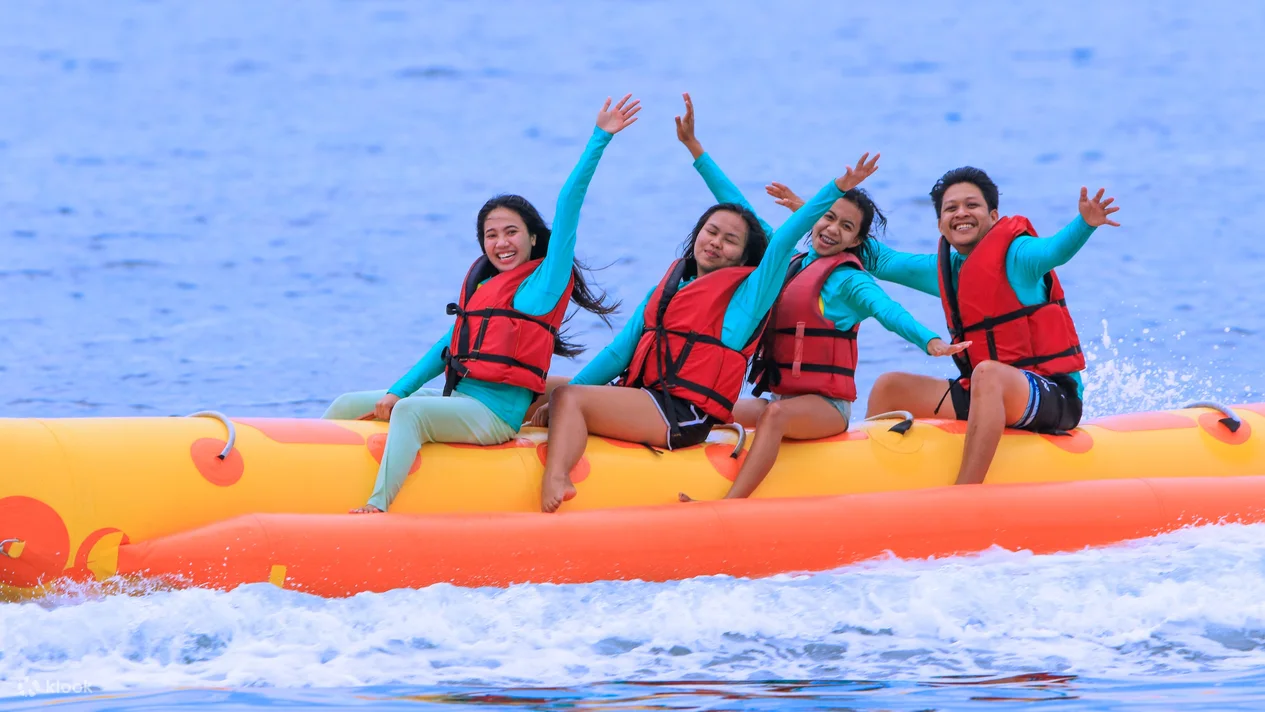 berangkatholic pernah dengar Rolling Donut ngga, sih? Eits, jangan ngira kita disuruh bikin donat di air ya, guys. Rolling Donut termasuk permainan air yang family- friendly, loh, karena maksimal pesertanya 5 orang. Bisa dibilang Rolling Donut ini mirip Banana Boat, tapi perahunya berbentuk bulat. Perahu tersebut bakal dikaitin ke speedboat dengan jarak 10 meter, nah tantangannya muncul pas perahu kita ditarik speedboat sampe nerjang tingginya ombak. Berangkatholic tenang aja, permainan ini dijamin aman karena setiap pesertanya diharuskan pakai life jacket atau jaket pelampung.
